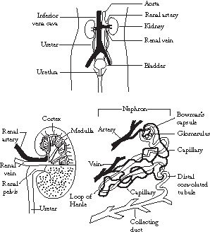 Excretory pathway in kidney – Blood is carried by the renal artery to the nephrite from there to renal pyramid leading to pelvis to the ureter, then to the urinary blade.