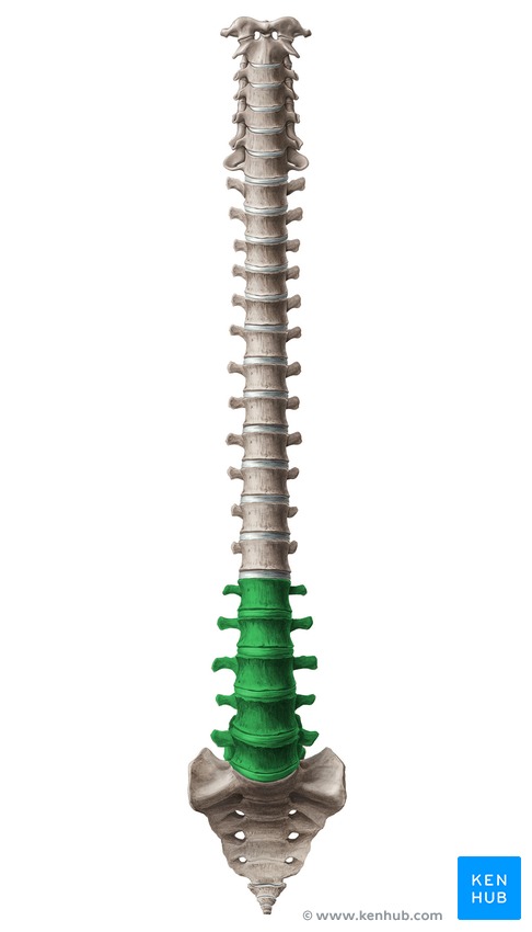 The lumbar vertebrae are located at the bottom section of the vertebral column, inferior to the rib cage and superior to the pelvis and sacrum. Since these vertebrae are most largely responsible for bearing the weight of the upper body (and permitting movement), they are logically also the largest segments of the vertebral column. These vertebrae are characterized by the absence of the foramen transversarium within the transverse process, and by the absence of facets on the sides of the body