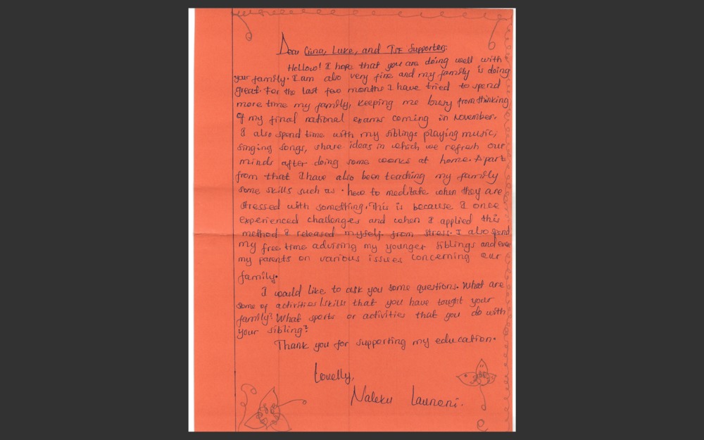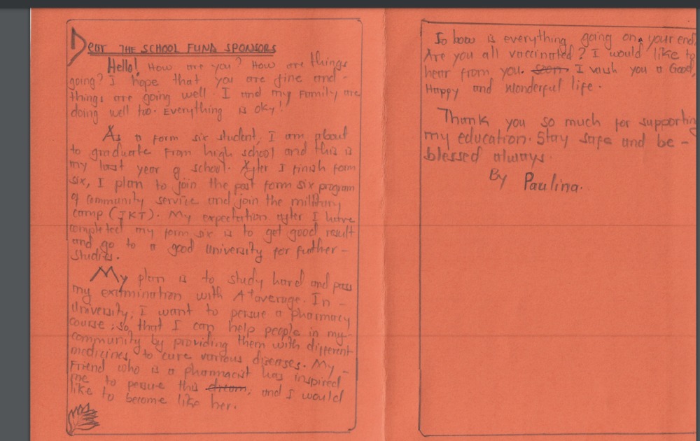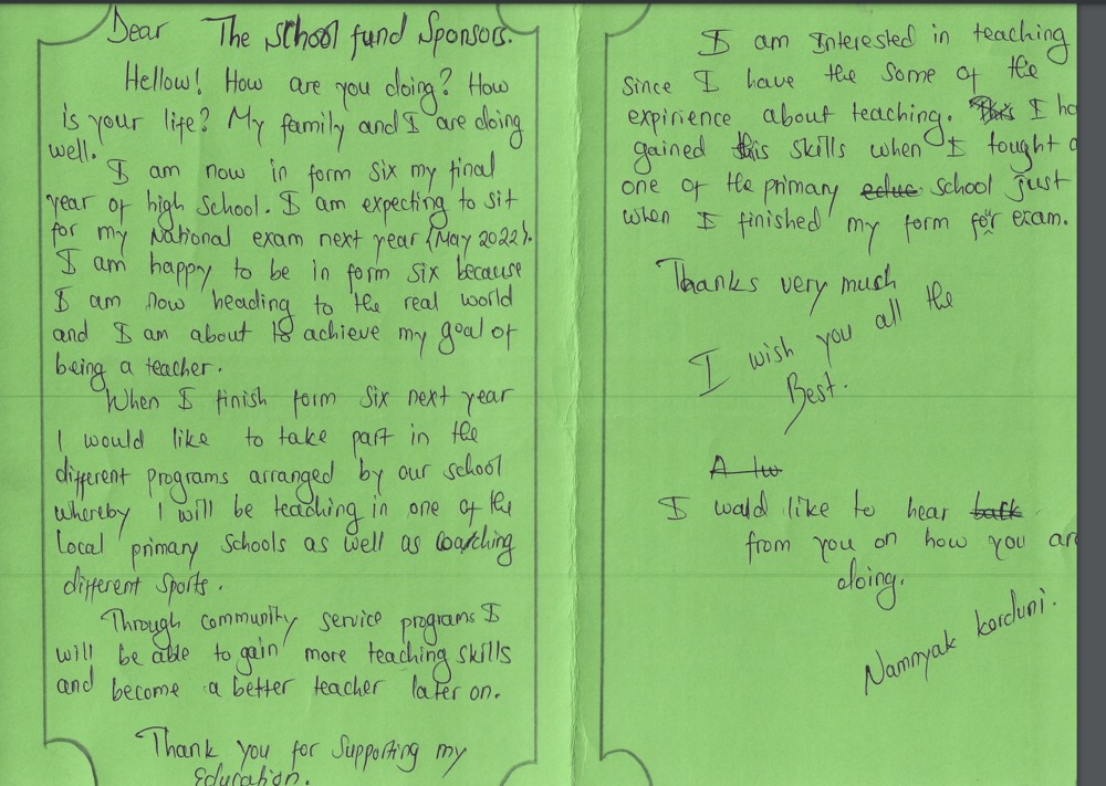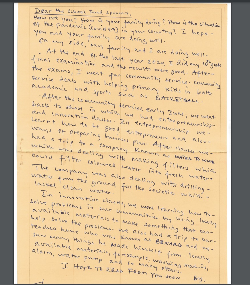 It is my very great pleasure to let you know that I have been able to donate the money to cover your tuition for 2027, so you will be able to attend Form 3 next year. It is my intention to pay your tuition until you graduate from secondary school.