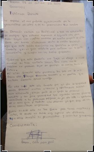Le expreso mi más profundo agradecimiento por la generosidad tan amable. La donación recibida nos beneficiará a todos los estudiantes de Mosqoy que estamos esperando el siguiente año para poder seguir con nuestros anhelos de nuestro proyecto de vida para ser buenos ciudadanos dentro de nuestra sociedad. Ya que este fondo económico nos beneficia de forma carente y es un gran aliciente para continuar con la parte académica y cumplir con los sueños propuestos. Sabemos que esta pandemia nos trajo un atraso a nivel mundial en todo contexto social. Pero cada uno de nosotros no podemos dejar de percibir el cambio hacia el futuro.