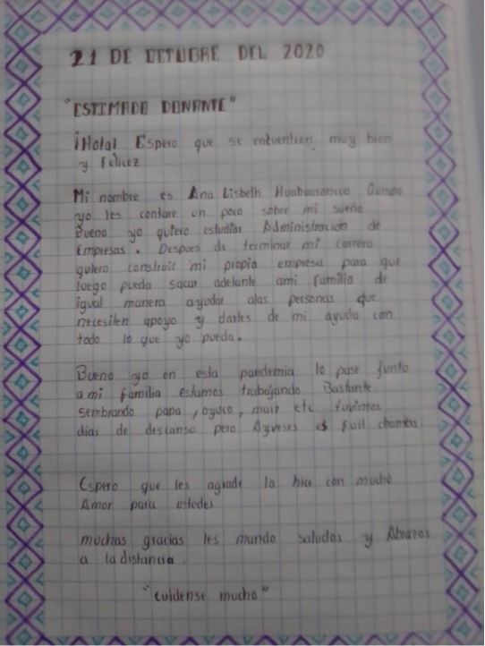 Por medio de la presente me dirijo a usted a nombre de Mosqoy. Somos un grupo de alumnos que no tenemos la cantidad de dinero necesario para poder estudiar, somos de diferentes comunidades, soy de una comunidad muy lejana y les voy a compartir la experiencia que voy teniendo durante la pandemia, yo estuve durante este tiempo en el valle junto a mis padres y veo a la gente cómo trabaja duro para obtener 10 céntimos y la situación en allí es muy complicada y muy doloroso porque veo a mis papás que ni siquiera tienen tiempo para estar en la casa, ellos cada día tienen que ir a la chacra a trabajar y la verdad me da pena, no quisiera estar en el lugar de ellos así que me pongo a pensar que tengo la obligación de estudiar para así sacar adelante a mi familia, no quiero verlos sufrir. Agradezco a ustedes señores donantes por apoyarnos, estoy muy contenta y feliz, se que con vuestro apoyo voy a salir adelante.
