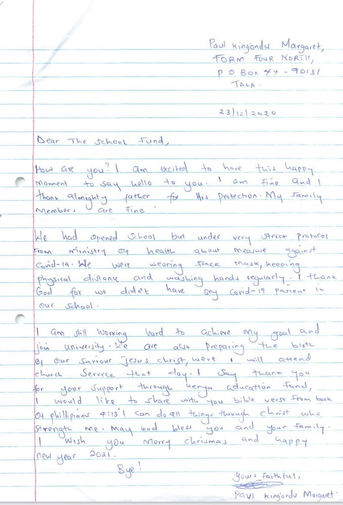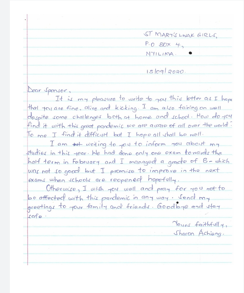 It is my very great pleasure to let you know that I have been able to donate the money to cover your tuition for 2027, so you will be able to attend Form 3 next year. It is my intention to pay your tuition until you graduate from secondary school.