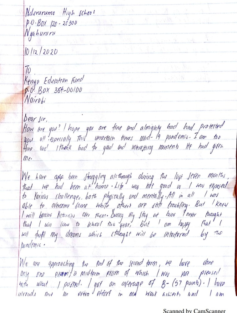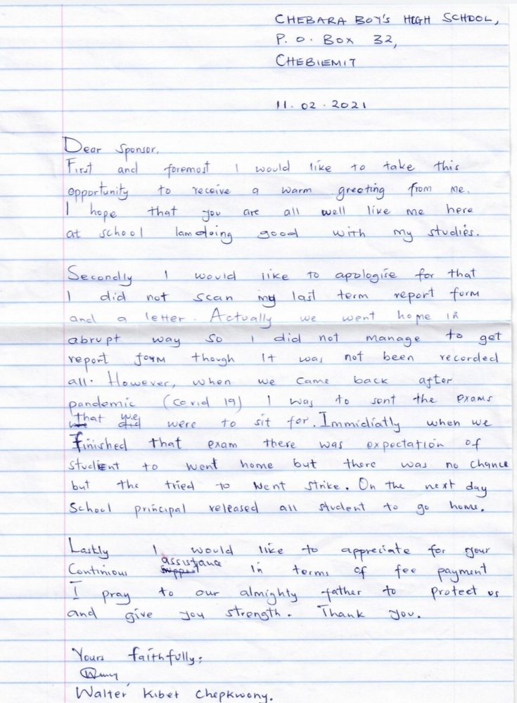 I am very grateful for your support towards paying my school fees. I also thank you for ensuring that I stay at school and I promise to get better grades on my opener examination.This makes me remain focused towards achieving my goals.